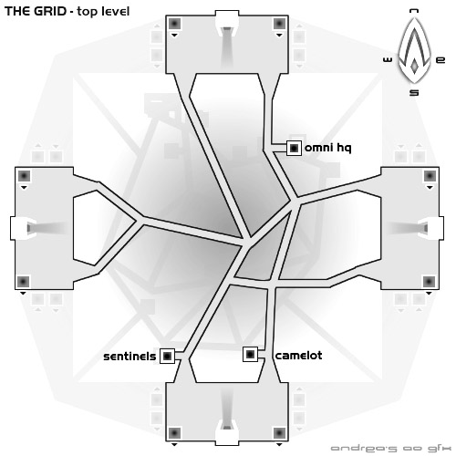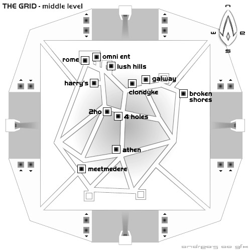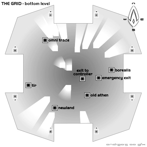 In my early days of playing AO, I had such a poor computer that I couldn't make out the names written on the grid destinations, so I made this map to help me navigate the different levels quickly. Even if the titles are readible, seeing the layout of the locations on a map helps tons. I hope it's of use to anyone starting out in AO. :-)