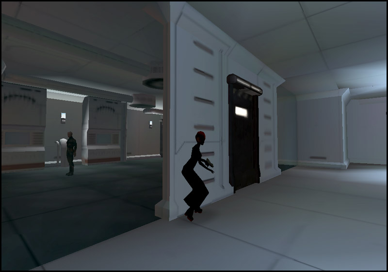 Prudencia carefully approaches the entrance to the office of the main target of elimination, as he stands pondering, totally unaware of his oncoming death.
