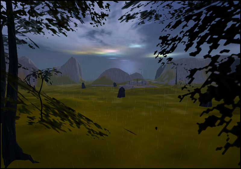 ![]() Prudencia had been browsing through the available missions at an automat when she spotted an interesting one which promised a nice reward: a long black leather trenchcoat. Now being the gothic minded chick that she was, Prudencia knew this was a must-accept-mission. Thus she gathered her gear and headed out to an area called "The Shacks". And indeed, once she arrived, there were shacks embedded within a handful of small mountains. Rain beat down and lightning pierced the evening sky with electricity as Prudencia ran from mountain to next, searching for the right place. | ||