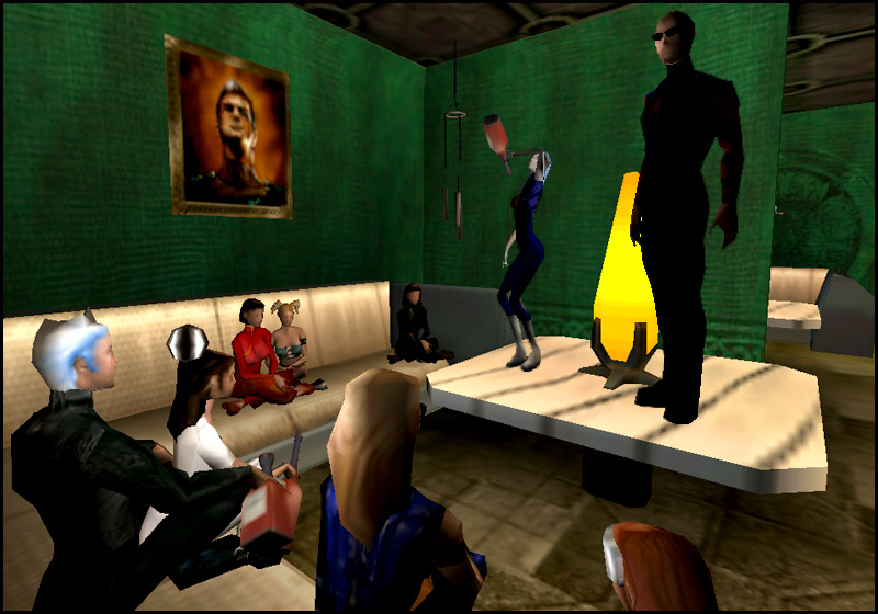 ![]() Things heat up at the Rompa bar as Lucrecia gets wild with a bottle of cider up on the table. Prudencia sits in the farthest darkest corner feeling a bit flustered as a pair of ladies fondle each other beside her. Prudencia's dear friend Limona sits in Threx's lap whilst a big bossomed blonde makes eye contact with a man trying to make an impression by standing on the table. | ||