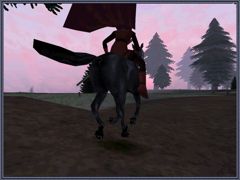 ![]() I was awoken at dawn by one of the townsmen. An urgent message was to be delivered to the neighboring town, and I was entrusted with this important task since I had the fastest horse. I frantically pulled on what clothes could be found and departed upon my trusty steed along the pathway, just as the sun was about to rise. |
