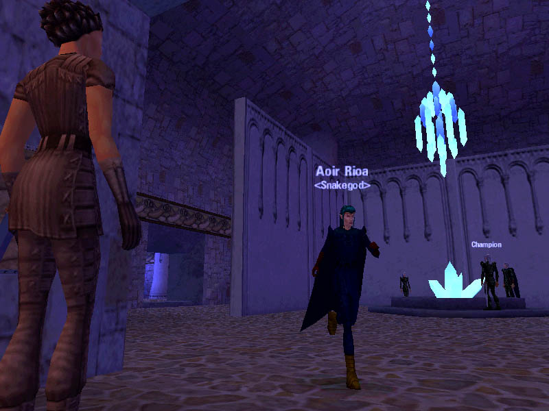 ![]() Here I have just entered a lovely tall building that glowed a purple light from within. My attenion is drawn not only to the giant blue crystal centerpice, but at how stylishly people are dressed. I felt a bit embarrassed about my humble brown leather outfit. |